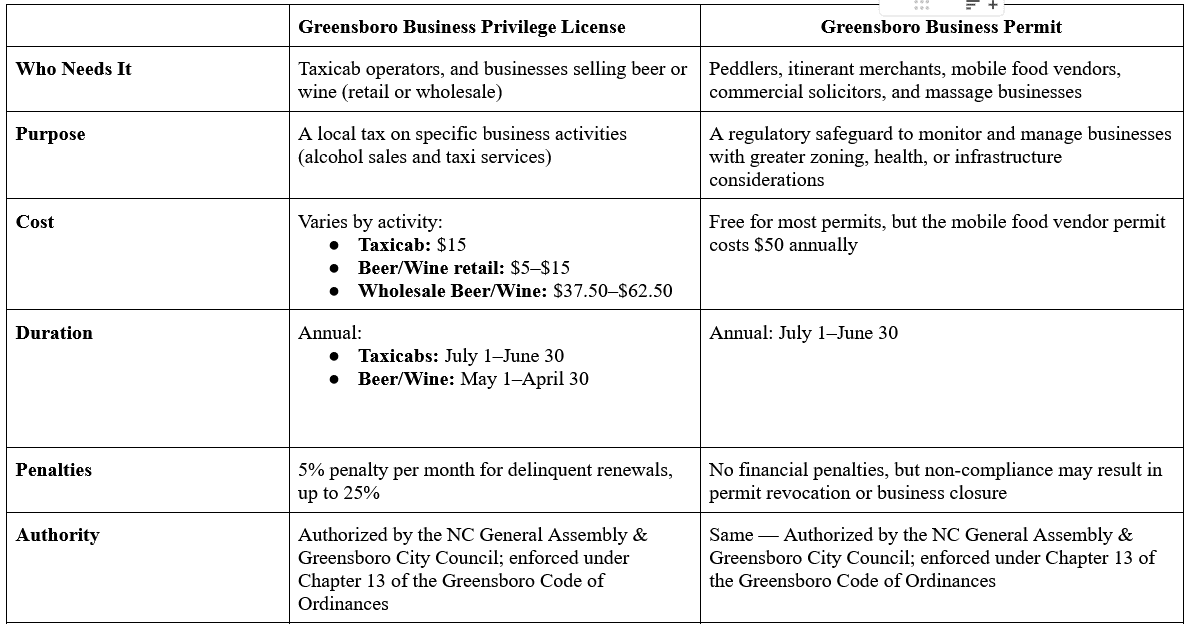 While you can find more specific permits (e.g., those for food trucks) on Greensboro’s Permits & Licenses page, business privilege licenses and business permits are the two main licenses the city of Greensboro issues to local companies.